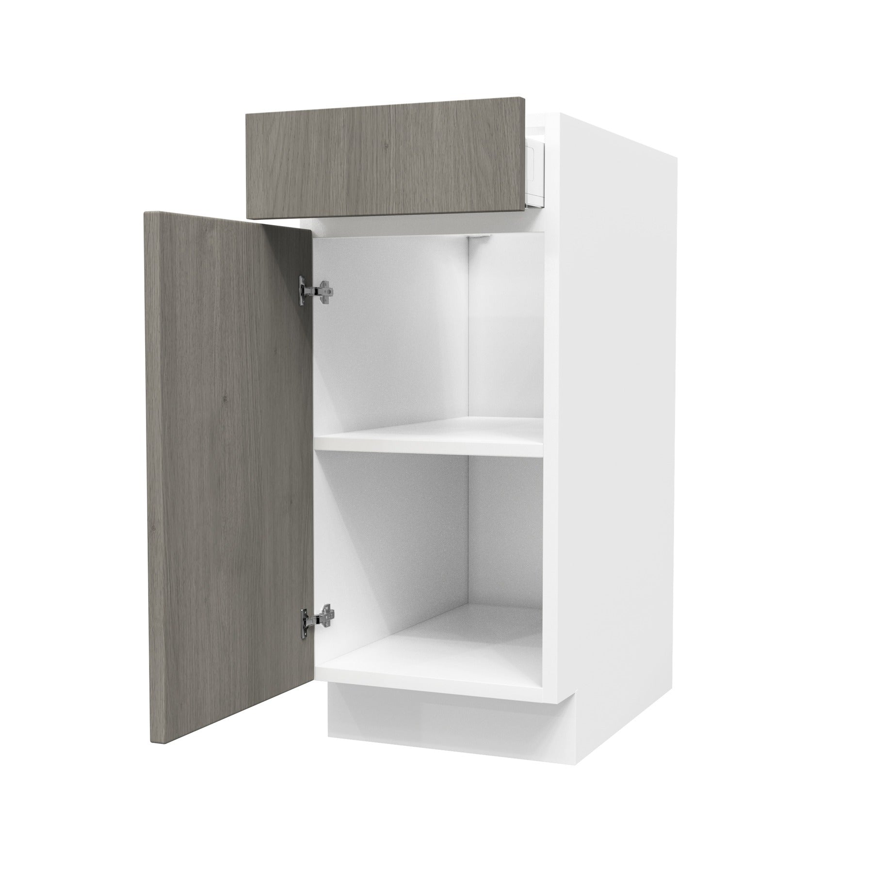 Single Door Base Cabinet| Matrix Silver | 15W x 34.5H x 24DThe Matrix Collection is composed of 3/4" vinyl laminated plywood with a frame-less box construction. The metal drawers are outfitted with full extension, under-mount drawer glides, as well as the soft-close feature. The adjustable soft close hinges, 3/4" adjustable full-depth plywood shelves, and dowel and glue-clamped assembly construction create a solid, durable framework for your cabinetry. Features: