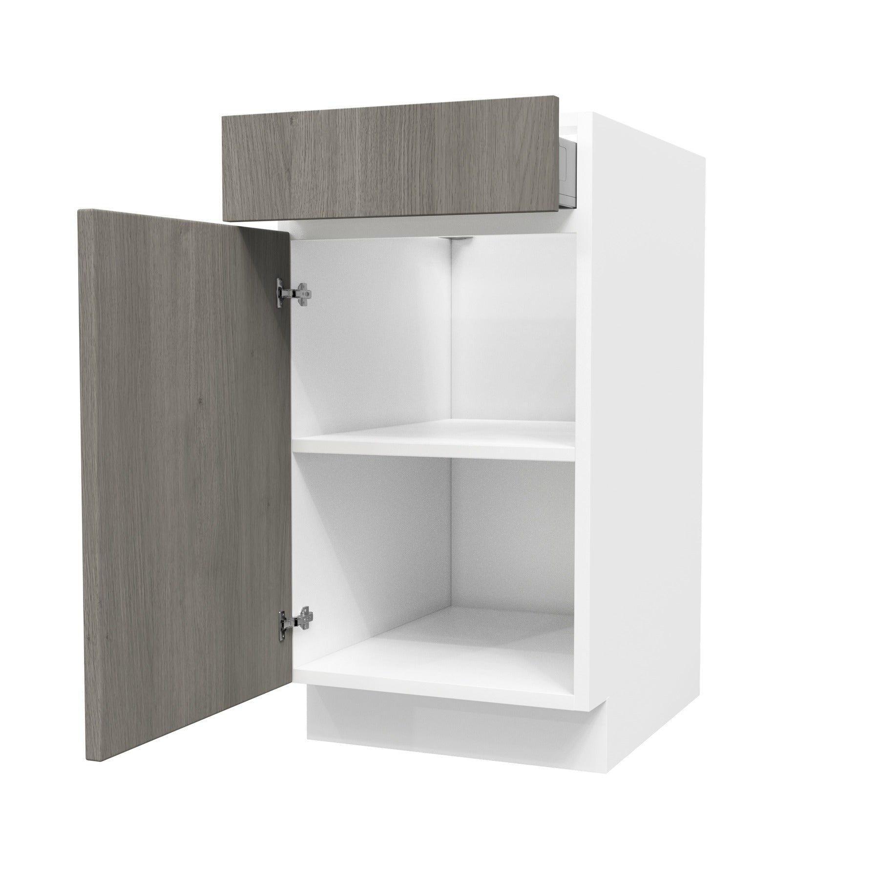 Single Door Base Cabinet| Matrix Silver | 18W x 34.5H x 24DThe Matrix Collection is composed of 3/4" vinyl laminated plywood with a frame-less box construction. The metal drawers are outfitted with full extension, under-mount drawer glides, as well as the soft-close feature. The adjustable soft close hinges, 3/4" adjustable full-depth plywood shelves, and dowel and glue-clamped assembly construction create a solid, durable framework for your cabinetry. Features:
