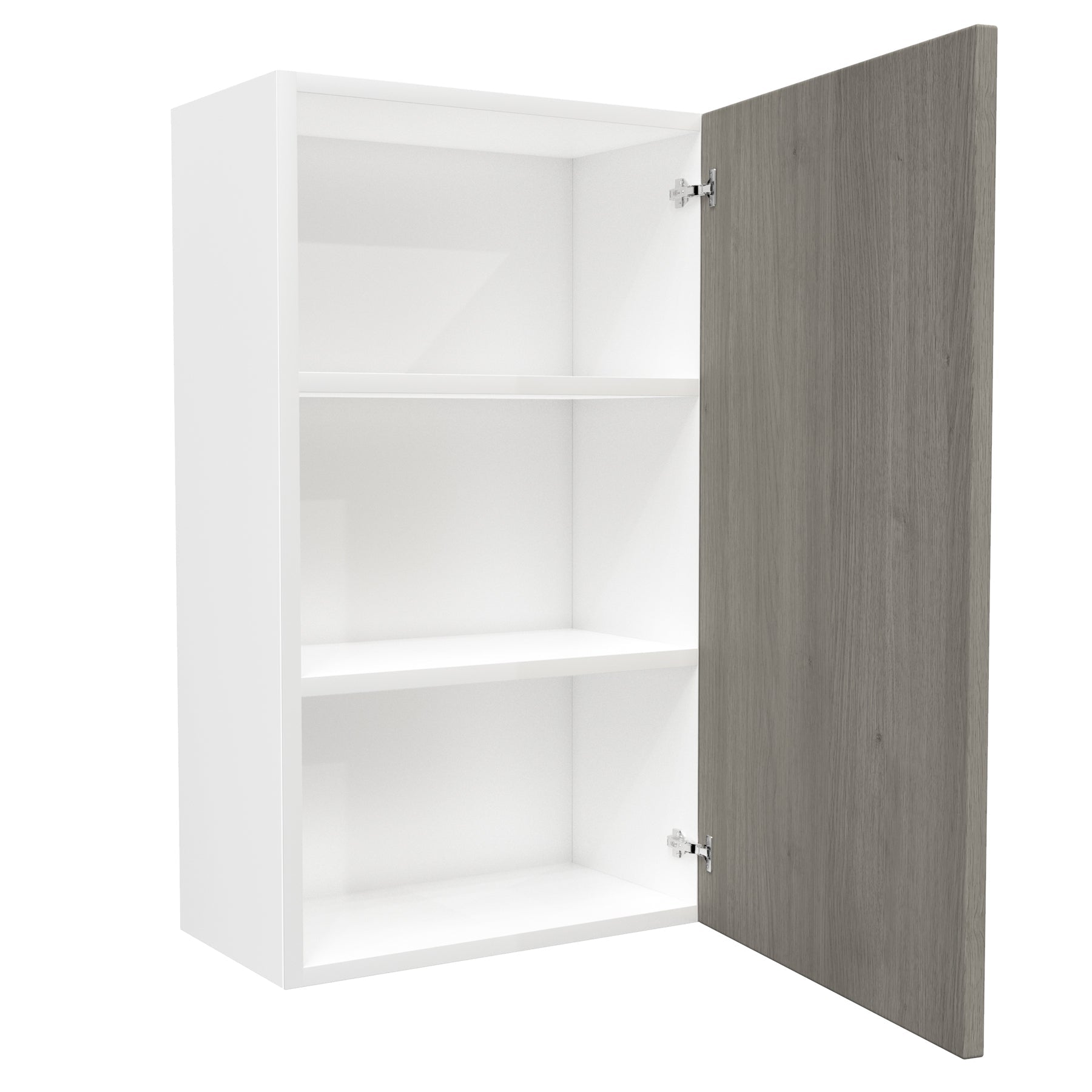 Single Door Wall Kitchen Cabinet| Matrix Silver | 21W x 36H x 12DThe Matrix Collection is composed of 3/4" vinyl laminated plywood with a frame-less box construction. The metal drawers are outfitted with full extension, under-mount drawer glides, as well as the soft-close feature. The adjustable soft close hinges, 3/4" adjustable full-depth plywood shelves, and dowel and glue-clamped assembly construction create a solid, durable framework for your cabinetry. Features: