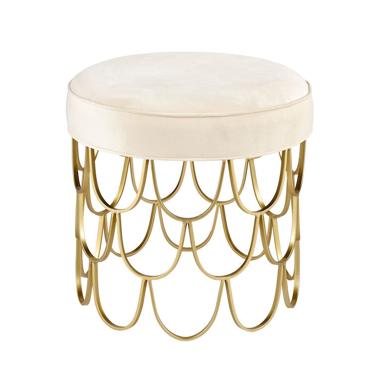 The Sirene Ottoman has an elegant round seat upholsered in beige velvet, and a cylindrical base made from three tiers of scalloped brass finished metal wires.