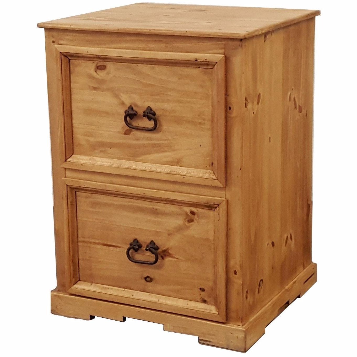 Wood filing cabinet with two drawers. Has a medium stain and wax finish to keep the look of a rustic piece. Includes metal rails for filing papers. Each drawer has two rails that are adjustable for letter or legal size documents.