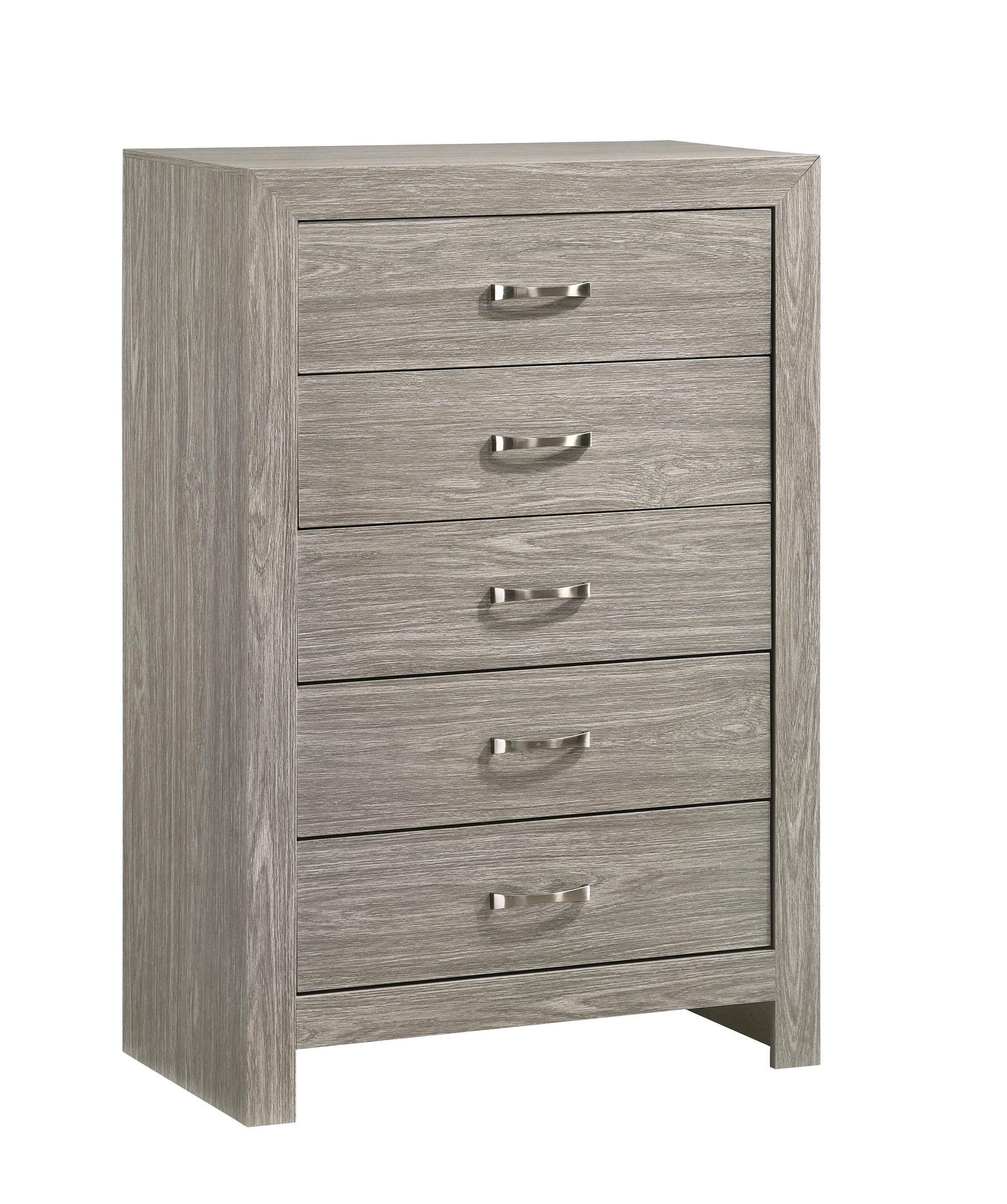 Yasmine White Modern Style Chest in Gray finish Wood, 47 x 16 x 31, 80lbs. Cosmos Furniture's Yasmine White modern style Chest in gray finish wood brings simplicity to life with straight lines. This modern Chest features five (5) deep drawers which provide extra storage drawers to provide ample storage. The drawers have dovetail construction with full extension glides and are dust proof. Also the drawers have sturdy nickle brushed finished accented hardware to enhance the sophisticated look. The bottom drawer is dust proof. Matching more bedroom pieces are sold separately to complete the entire look of your excellent taste. - Modern Style Chest - In Gray finish Wood - Futuristically Simple yet Functional - Five (5) deep Drawers and one (1) Lift-top - Nickel with Crystal finished accented Hardware - Full extension deep wood box Drawers glides - Dovetail construction Drawers - Bottom Drawer dust proof - Matching bedroom pieces sold separately -